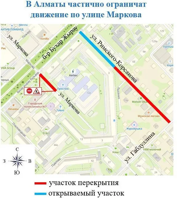 "В связи с этим с 3 июля по 25 августа 2025 года в Бостандыкском районе Алматы будет закрыто движение автотранспорта по улице Маркова – на участке от бульвара Бухар Жырау до детского сада "Зайка". Движение будет закрыто в обоих направлениях".