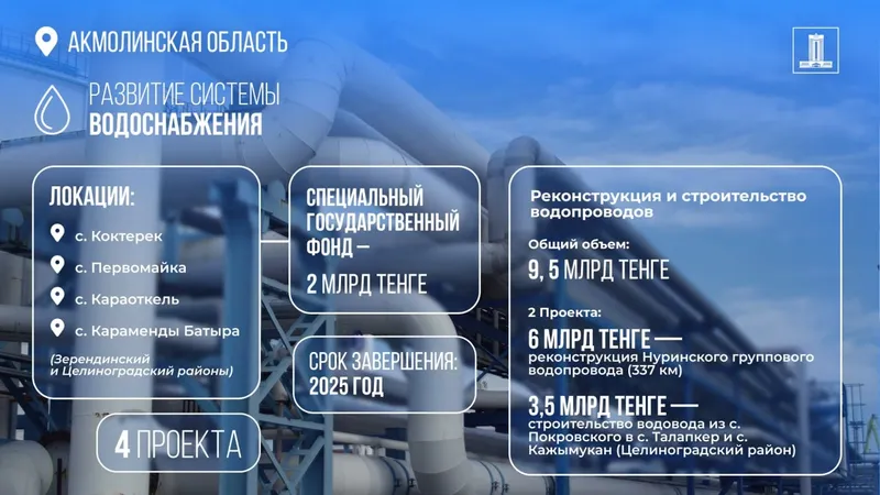 Также идут работы по реконструкции Нуринского группового водопровода и строительству водовода из села Покровское в села Талапкер и Кажымукан. Общая стоимость обоих проектов 9,5 млрд тенге.