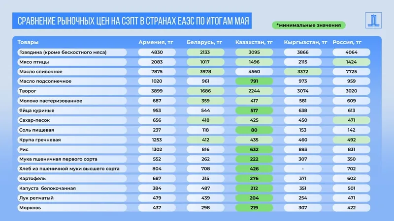 Также отмечено, что Казахстан сохраняет лидирующие позиции по доступности продовольствия среди стран ЕАЭС. В частности, в Казахстане зафиксированы минимальные цены на куриные яйца, муку, хлеб, подсолнечное масло, соль, рис, картофель, капусту, лук, морковь.