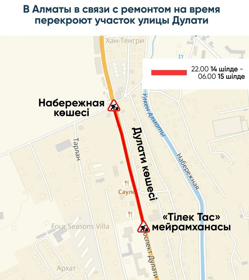 Согласно распространенному заявлению, с 22:00 14 июля до 06:00 15 июля движение будет перекрыто на участке от ресторанного комплекса "Тілек Тас" до улицы Набережная.