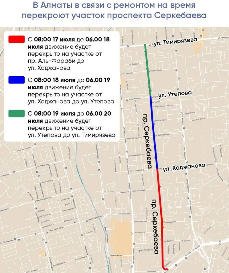 Так, согласно сведениям Telegram-канала AlmatyJoly, с 08:00 17 июля до 06:00 18 июля движение будет перекрыто на участке от пр. Аль-Фараби до ул. Ходжанова.