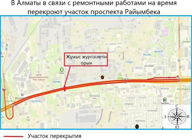 Так, с 22:00 18 июля до 08:00 19 июля в Алматы движение автотранспорта будет частично ограничено на проспекте Райымбека от проспекта Сейфуллина до улицы Бокейханова в обоих направлениях.