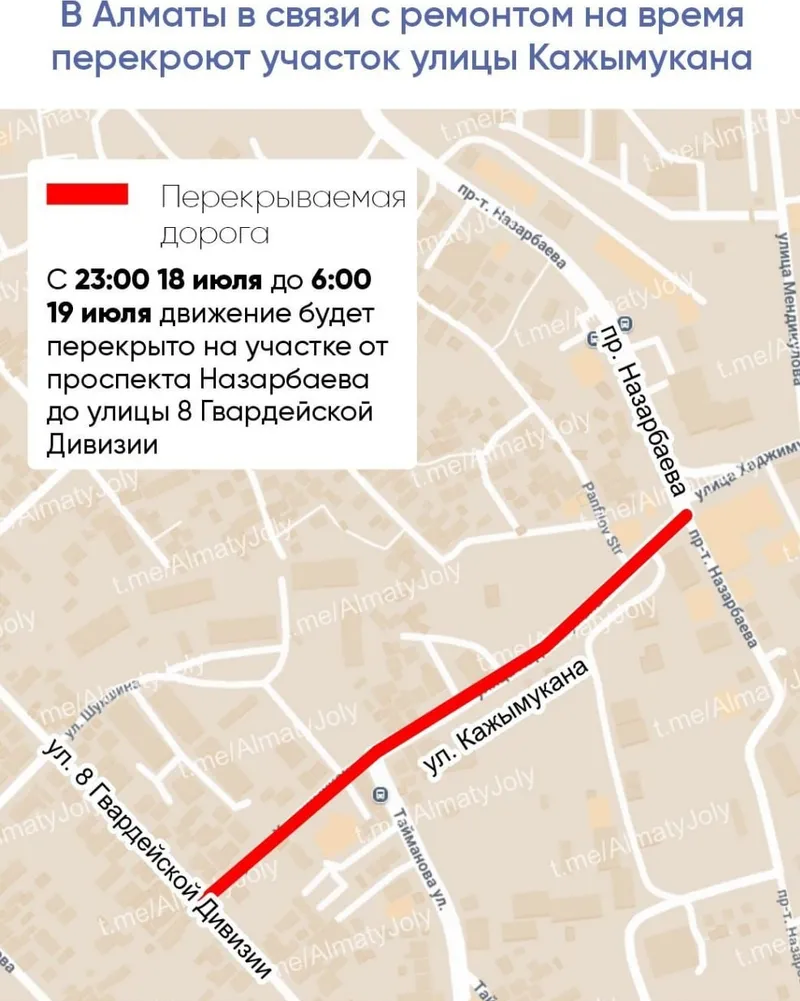 Согласно данным, опубликованным в Telegram-канале AlmatyJoly, с 23:00 18 июля до 6:00 19 июля движение будет перекрыто на участке от проспекта Назарбаева до улицы 8 Гвардейской дивизии.