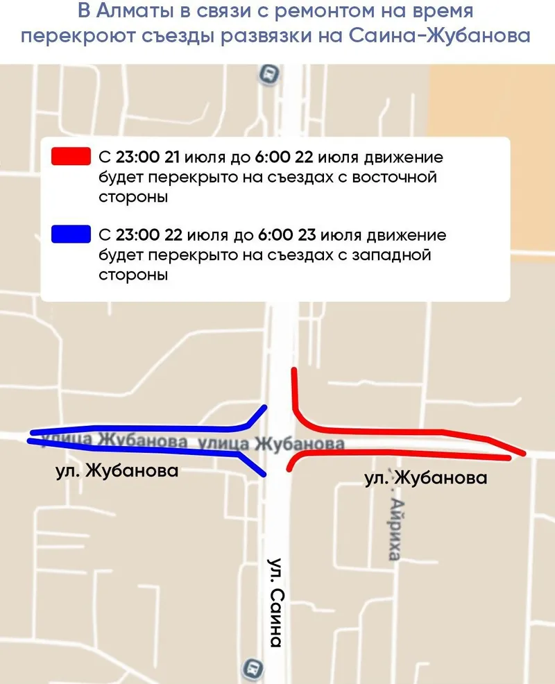 В Алматы в связи с ремонтом временно ограничат движение на съездах транспортной развязки на пересечении улиц Саина и Жубанова. Об этом Zakon.kz сообщили в акимате города.