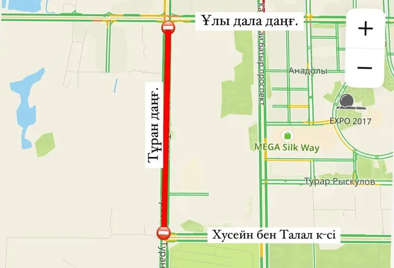 "По проспекту Туран на участке от улицы Хусейн бен Талал до проспекта частично будет перекрыто движение. Транспорт будет ехать в обоих направлениях, но по одной из сторон", – пояснили в акимате.