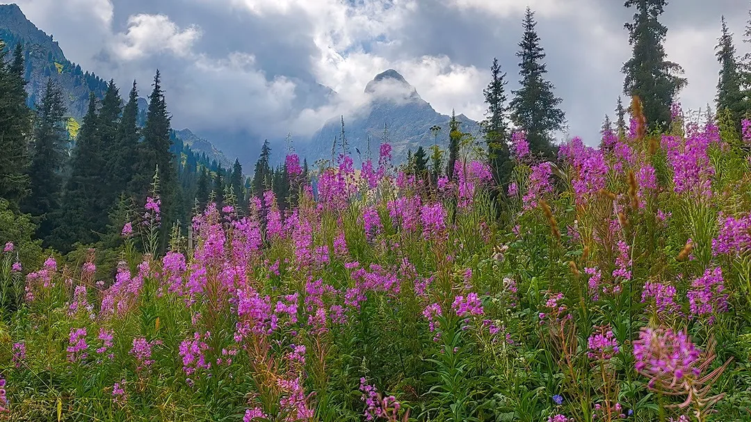 На кадрах – густые заросли ярко-сиреневого иван-чая на фоне хвойных лесов и скалистых склонов.