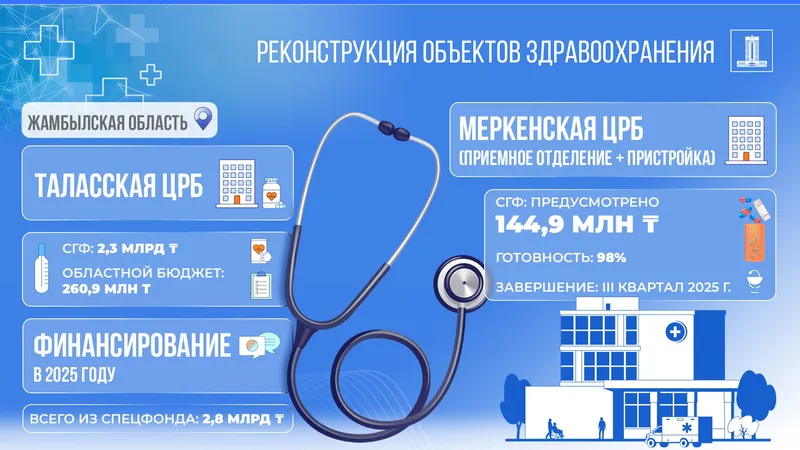 Из релиза правительства за 5 августа 2025 года следует, что в рамках национального проекта "Модернизация сельского здравоохранения" предусмотрена реконструкция межрайонных многопрофильных центральных больниц в Меркенском и Таласском районах Жамбылской области.