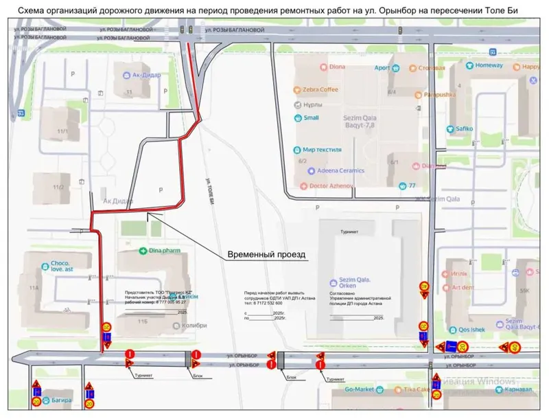 "В рамках проекта "Строительство ул. Толе би от ул. Р. Баглановой до пр. Улы Дала" будут проведены работы по устройству инженерных сетей и обустройству перекрестка на пересечении улиц Толе би/Орынбор. В связи с этим с 7 августа по 1 сентября текущего года будет полностью перекрыто движение на данном участке".Управление транспорта и развития дорожно-транспортной инфраструктуры Астаны