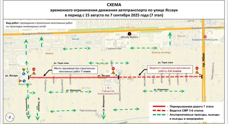 "В связи с проведением строительно-монтажных работ по прокладке водопроводных и канализационных сетей в мкр. Достык в период с 15 августа по 7 сентября будет осуществляться полное перекрытие движения по ул. Яссауи".