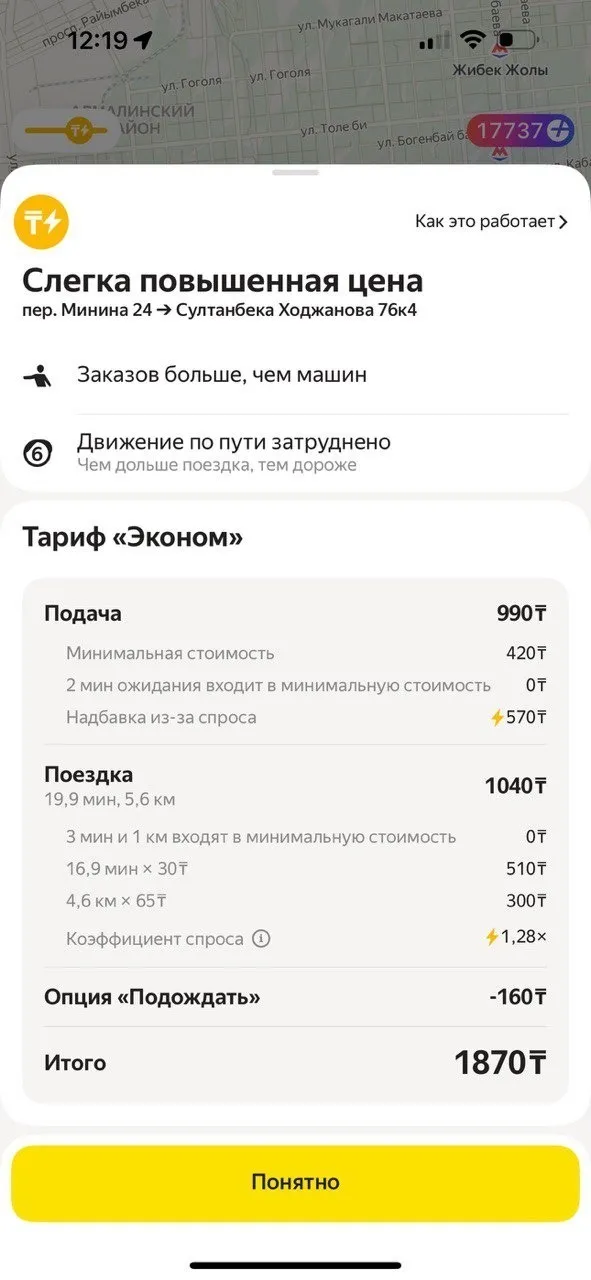 Детализацию цены можно увидеть до заказа такси. Для этого необходимо нажать на значок тенге в левом верхнем углу экрана смартфона после выбора тарифа и маршрута поездки. Ранее в мае 2025 года в рамках антимонопольного комплаенса Яндекс Такси взял на себя ответственность разработать функцию "детализация цены" для пассажиров.