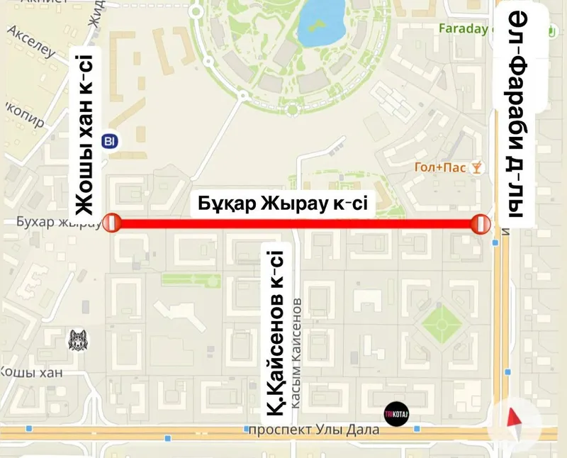При этом движение транспорта будет организовано в одном направлении. Сначала с проспекта Аль-Фараби в сторону проспекта Мангилик Ел, затем с улицы Жошы хана в сторону проспекта Аль-Фараби.