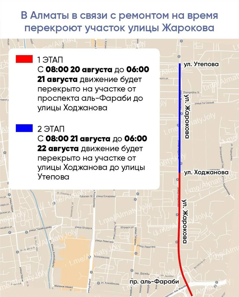 - с 08:00 20 августа до 06:00 21 августа движение будет перекрыто на участке от проспекта аль-Фараби до улицы Ходжанова;
