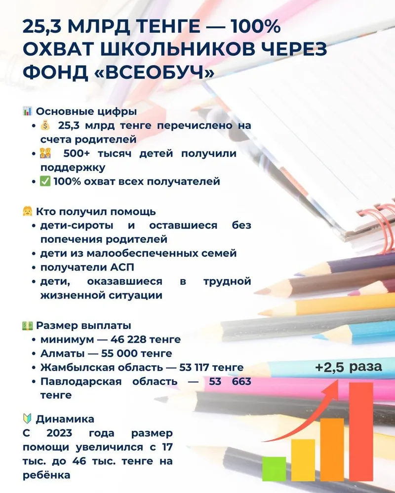 "Ежегодно фонд "Всеобуч" помогает детям подготовиться к началу нового учебного года. Это позволяет семьям обеспечить детей всем необходимым к школе и гарантирует равные возможности для каждого ребенка. Важно отметить, что "Всеобуч" является одной из ключевых мер государственной поддержки", – подчеркнула председатель Комитета по охране прав детей Министерства просвещения РК Насымжан Оспанова.