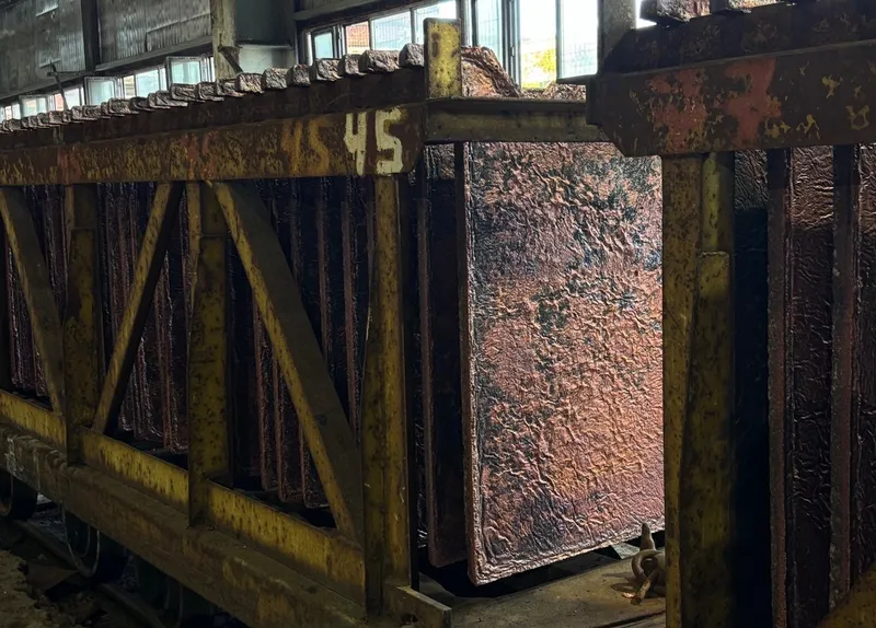 После застывания пластины отправляются дальше – в цех электролиза, где медь проходит последнюю стадию очистки. В электролитных ваннах под действием электрического тока она превращается в катодный металл чистотой почти 99,99%.