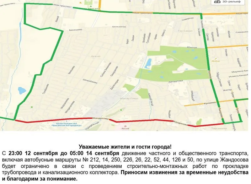 Так, согласно распространенному заявлению, с 23:00 12 сентября до 05:00 14 сентября будет ограничено движение автотранспорта по ул. Жандосова в восточном направлении, начиная от ул. Килыбай Медеубекова, а также в западном направлении от ул. Ашимова.
