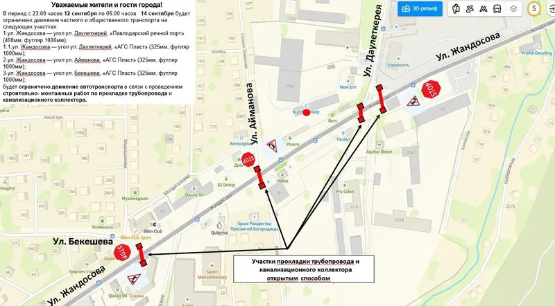 - ул. Жандосова – угол ул. Даулеткерей (трубопровод 400 мм, футляр 1000 мм);