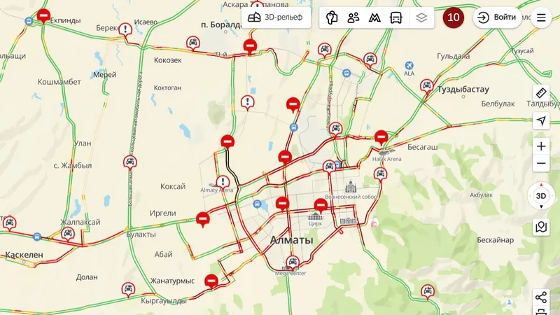 В Алматы сегодня, 16 сентября 2025 года, после 18:00 зафиксированы пробки, которые оцениваются в 10 баллов, сообщает Zakon.kz.