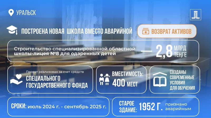 Ранее из средств Специального государственного фонда правительством выделено 2,8 млрд тенге на строительство школы. Современное здание рассчитано на 400 учащихся и оснащено всем необходимым для комфортного обучения детей.