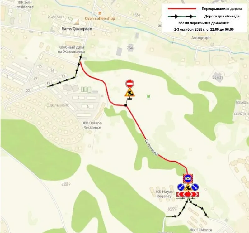 "В рамках реализации проекта по строительству и реконструкции арычной сети ливневой канализации в восточной части города Управление экологии и окружающей среды совместно с подрядной организацией ТОО "Компания АлматыДорСтрой" проведет работы по строительству перехода арычной сети по ул. Оспанова. В связи с этим движение автотранспорта будет временно ограничено на участке ул. Оспанова от ЖК "Эдельвейс" до ул. Жамакаева с 22:00 2 октября до 06:00 3 октября".