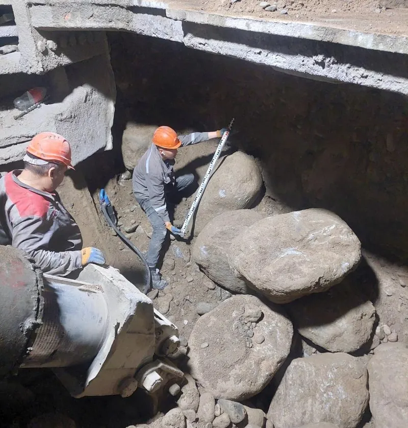 Отвечая на вопросы, Мурат Укшебаев отметил, что горнопроходческий комплекс ведет проходку и сразу формирует бетонную обделку тоннеля со скоростью до 4 м в сутки. На 120-метровом участке встречались валуны диаметром 1,5-2-3 м – их дробление и извлечение заметно снижает темп. При этом в исходном отчете проектировщика указывались размеры валунов 20-40 см (редко более 50 см).