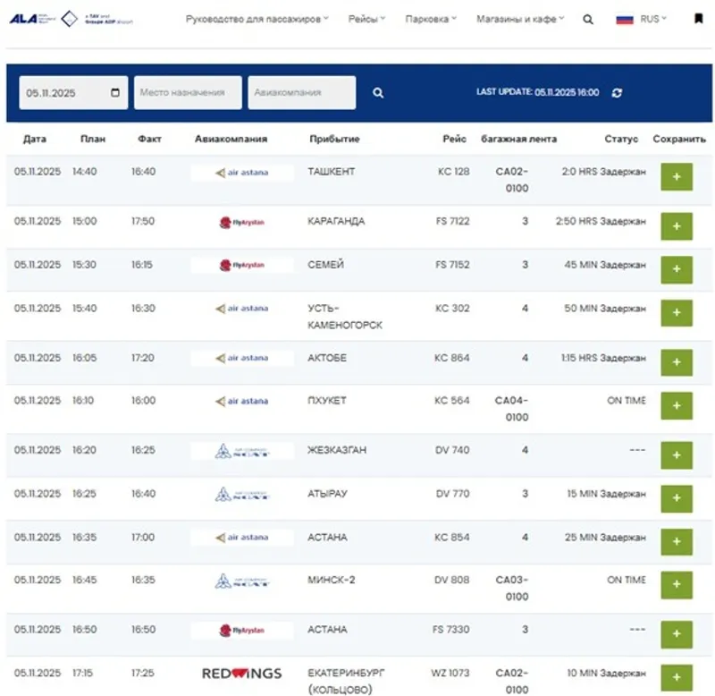 С утра 5 ноября 2025 года в Международном аэропорту Алматы были задержаны десятки рейсов, передает корреспондент Zakon.kz.