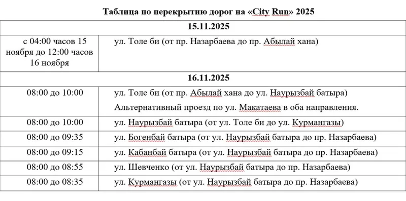 "16 ноября в Алматы состоится финальный забег сезона – City Run, организованный корпоративным фондом "Смелость быть первым". Оргкомитет City Run информирует жителей и гостей южной столицы о том, что в день забега движение на отдельных участках дорог будет частично ограничено".