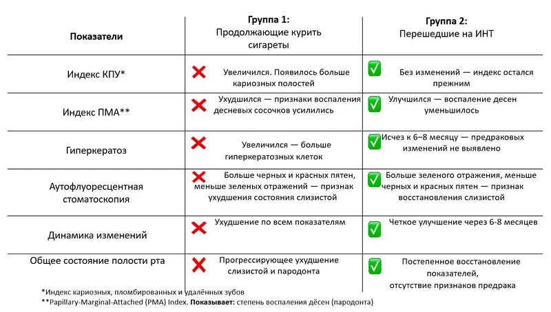 Раганин отметил, что в группе, продолжавшей курить, индекс КПУ слегка вырос из-за новых кариозных полостей, а PMA ухудшился, сигнализируя о прогрессе проблем с пародонтом. Цитология зафиксировала увеличение гиперкератозных клеток, а стоматоскопия показала больше красных и черных пятен при уменьшении зеленых отражений.