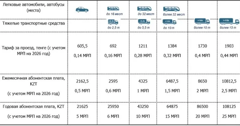 С 2026 года тариф за проезд для легковых авто изменится с 0,07 до 0,14 МРП (605,5 тенге).