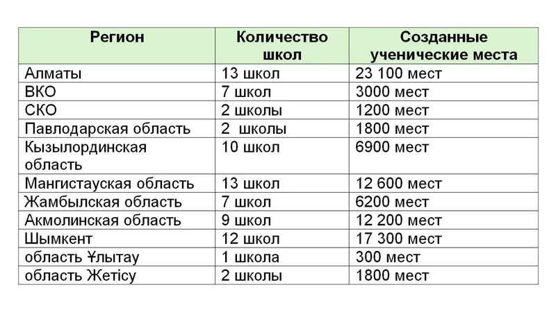 Об этом сообщил председатель правления АО "Samruk-Kazyna Construction" Маулен Айманбетов. По его словам, все 13 школ, строительство которых велось под управлением единого оператора – АО "Samruk-Kazyna Construction", полностью завершены и с актами ввода в эксплуатацию переданы на баланс местных исполнительных органов 28-29 августа – к началу учебного года.