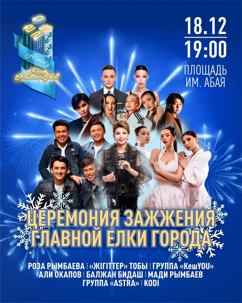 "Для вас выступят звезды казахстанской эстрады: Роза Рымбаева, группа "ЖІГІТТЕР", Али Окапов, группа "KешYOU", Балжан Бидаш, Мади Рымбаев, группа "ASTRA", Kodi и другие популярные артисты".Пресс-служба акимата Алматы