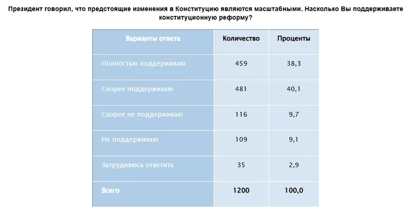 "В целом результаты социологического исследования свидетельствуют о заинтересованности и достаточно высокой осведомленности граждан о сути проводимой Конституционной реформы, полномочиях новых институтов представительной демократии, а также о наличии запроса на их открытую и эффективную работу", – резюмируют в институте.