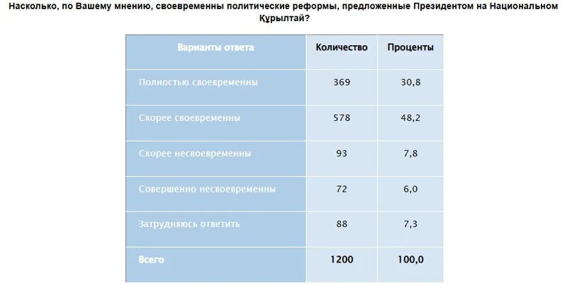 Среди наиболее значимых и запомнившихся реформ респонденты чаще всего называли переход к однопалатному Парламенту (31,1%), учреждение должности вице-президента (21,6%), создание Халық Кеңесі (20,1%), а также проведение Конституционной реформы в целом (15,2%).