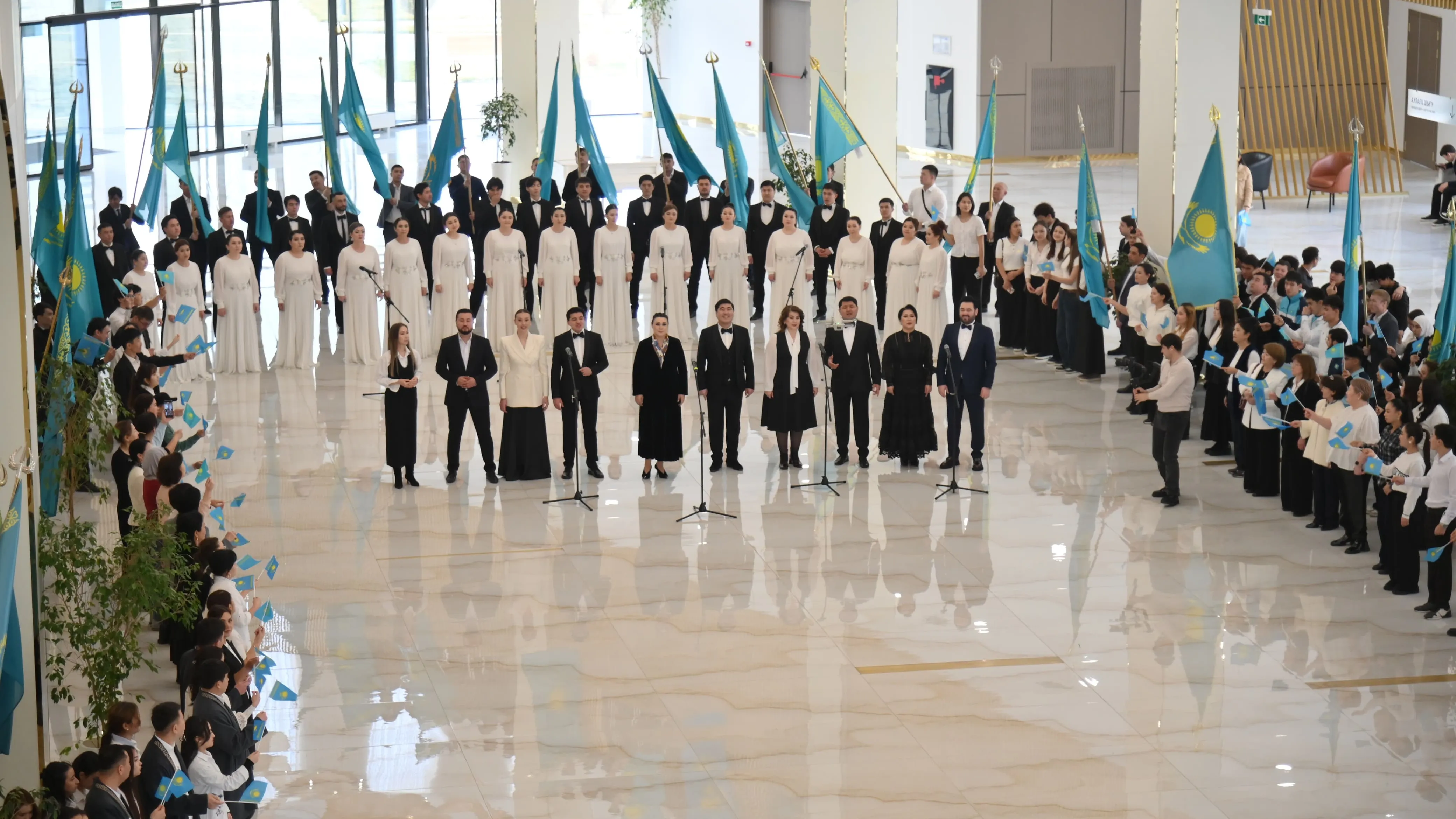 Кульминацией праздничной программы стало совместное исполнение песни "Ата заң бұл" народной артисткой Казахстана, всемирно известной оперной певицей Майрой Мухамедкызы и известными артистами города вместе с собравшимися зрителями. Развевающиеся в зале голубые флаги и приподнятое настроение участников стали наглядным отражением уверенности в будущем страны и высокого патриотического духа.