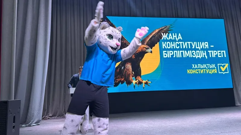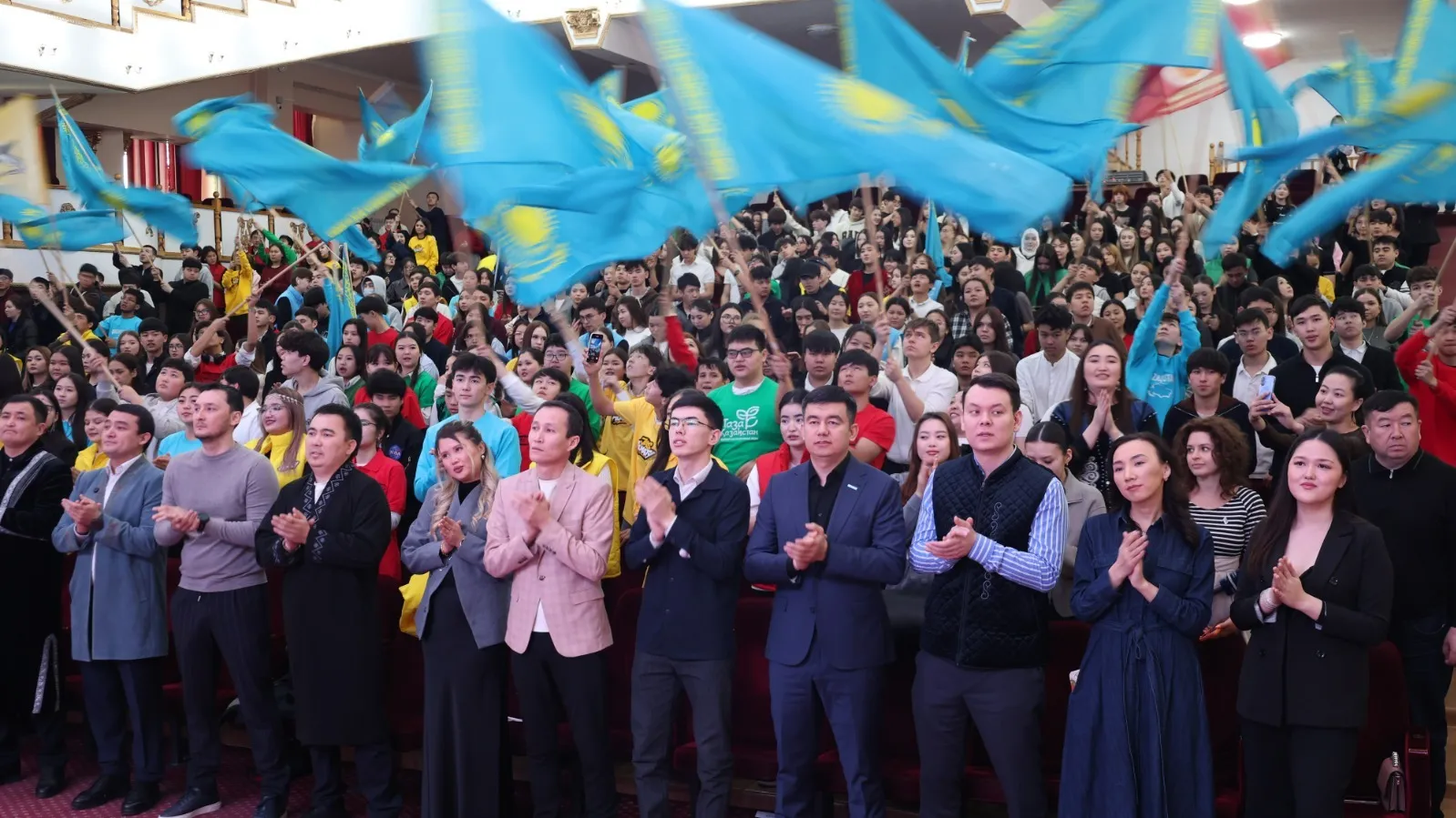 Собравшиеся в театре парни и девушки размахивали флагами Казахстана и дружно поддерживали выступающих. Молодежь активно поддерживал популярный в социальных сетях персонаж ИИ Барс Адилет.