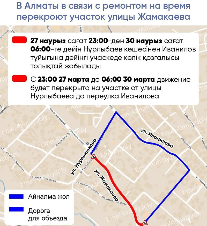 Так, с 23:00 27 марта до 06:00 30 марта движение будет перекрыто на участке от улицы Нурлыбаева до переулка Иванилова.
