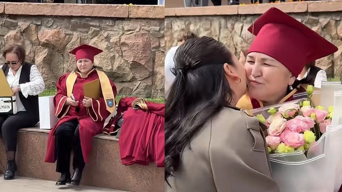 Ролик, опубликованный в TikTok пользователем nurbaevaaa___, мгновенно стал виральным, набрав более 920 тысяч просмотров и сотни восторженных комментариев. На кадрах запечатлена взрослая женщина в красной академической мантии, которая, увидев дочь с букетом цветов, не сдерживает эмоций радости.