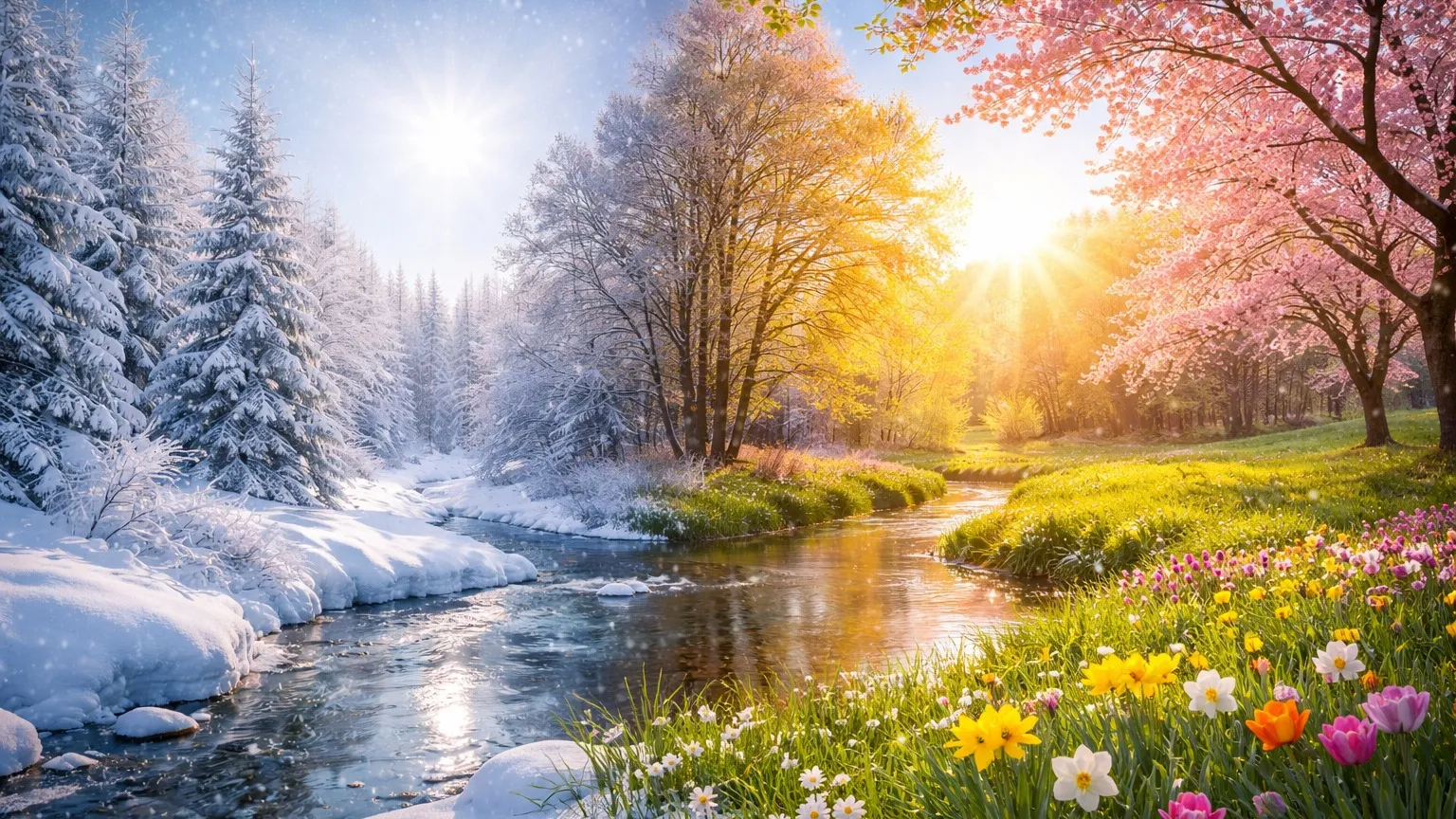 зима, деревья, снег, весна, солнце, цветы, фото - Новости Zakon.kz от 17.04.2026 11:16 Фото: сгенерировано с помощью ИИ