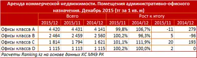 Стоимость аренды помещений административно-офисного назначения выросла заметнее всего в сегменте офисов класса «С». В декабре цена на такие офисы поднялась на 1,1%, до 1,8 тыс. тг за кв. м.