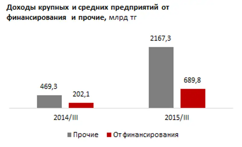 На фоне падения доходов от реализации продукции и оказания услуг значительно возросли другие виды доходов крупных и средних предприятий. Так, «прочие доходы» за 3 кв 2015 увеличились в 4,5 раза к предыдущему аналогичному периоду - до 2,1 трлн тг. (эта статья включает в себя в том числе доходы от курсовой разницы). А доходы от финансирования выросли в 3,5 раза - до 670 млрд. тг. (в т. ч. доходы по вознаграждениям, и доходы от изменения справедливой стоимости финансовых инструментов).