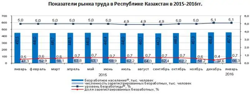Численность безработных в январе 2016 года, по оценке, составила 457,6 тыс. человек, уровень безработицы - 5,1%. Официально на конец января 2016 года зарегистрированы в органах занятости - 66,3 тыс. человек. Доля зарегистрированных безработных составила 0,7% от экономически активного населения.