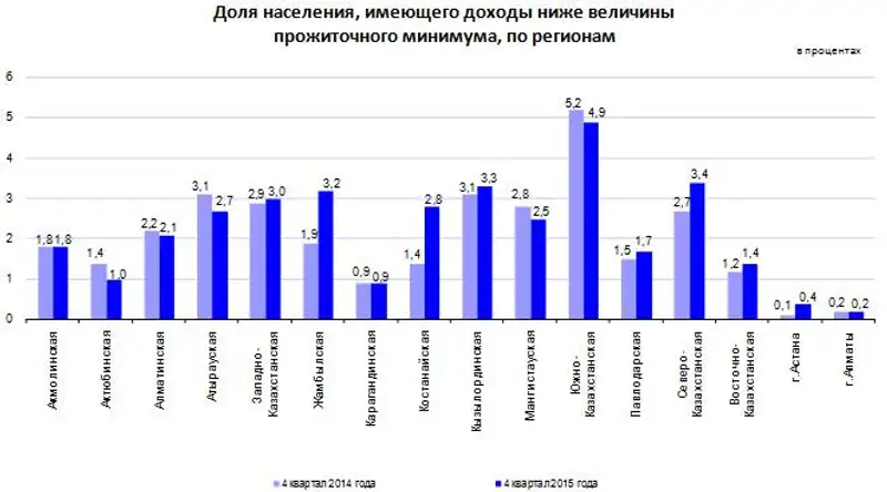 Наибольшая доля населения, имеющего доходы ниже величины прожиточного минимума в 4 квартале 2015 года приходится на Южно-Казахстанскую (4,9%), Северо-Казахстанскую (3,4%) области, наименьшая отмечается в городах Астана (0,4%) и Алматы (0,2%).