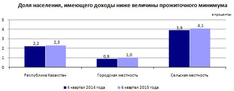 По данным обследования домашних хозяйств доля населения, имеющего доходы ниже величины прожиточного минимума, в Республике Казахстан в 4 квартале 2015 года составила 2,3% (407,9 тыс. чел.), что на 0,1 процентных пункта выше, чем в соответствующем периоде предыдущего года. В сельской местности доля населения, имеющего доходы ниже величины прожиточного минимума, превысила долю населения, имеющего низкие доходы в городской местности на 3,1% и составило 4,1% (310,7 тыс. чел.).