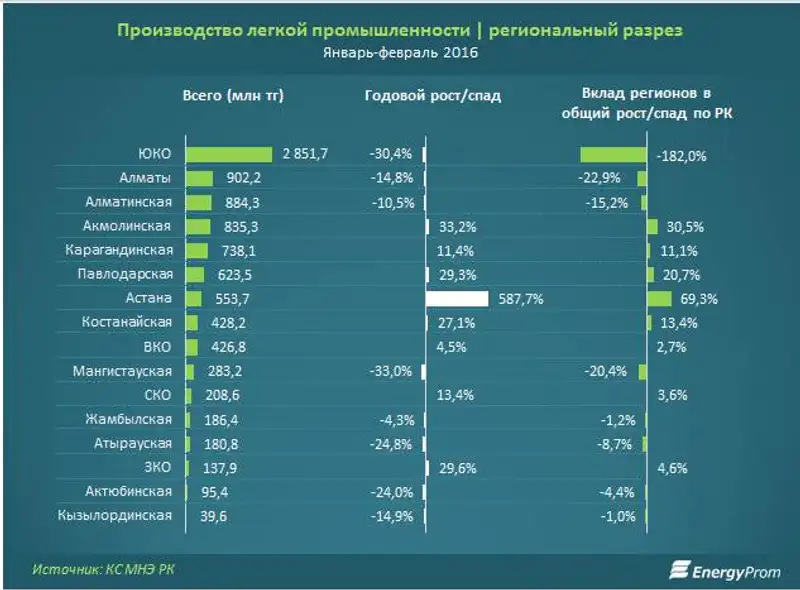 ЮКО за январь-февраль 2016 года сократила объемы производства к аналогичному периоду годом ранее на 30,4%, до 2,9 млрд тг, Алматы - на 14,8%, до 902,2 млн тг, Алматинская область - на 10,5%, до 884,3 млн тг.