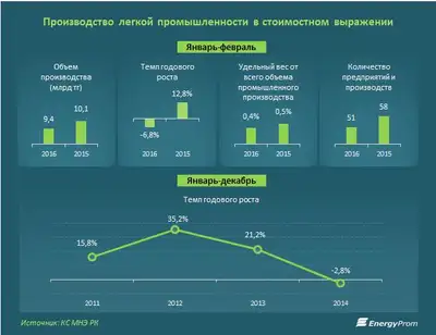 В натуральном выражении за январь-февраль 2016 наибольший рост к аналогичному периоду годом ранее отмечен в сегменте носочно-чулочных изделий (на 59,7%, до 222,9 тысячи пар), трикотажной одежды и аксессуаров для грудничков (на 55,4%, до 8,7 млн тг), и верхней трикотажной одежды (на 50,1%, до 6 тыс. штук).