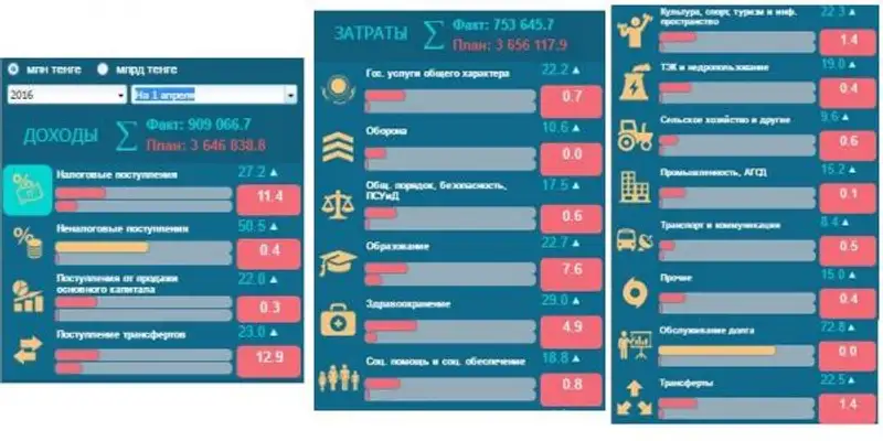 По состоянию на 1 апреля 2016 года в республиканский бюджет поступило 909,1 млрд тенге, тогда как по плану доходы должны были составить 3 646,8 млрд тенге. Налоговые поступления составили 27,2 млрд тенге, неналоговые - 50,5 млрд тенге, поступления от продажи основного капитала - 22 млрд тенге, поступление трансфертов - 23 млрд.