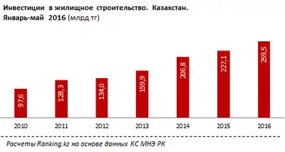 Инвестиции в жилищное строительство за январь-май 2016 года составили более 200 млрд тенге. При этом из республиканского бюджета было выделено более 10 млрд тенге. Рост по отношению к аналогичному периоду прошлого года составил 14,3%. Лидиром по количеству привлеченных инвестиций является Астана. Вместе с тем рост показателя отмечается в 13 районах РК.