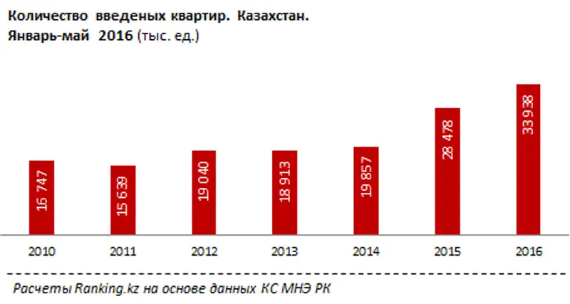 В Казахстане за январь-май 2016. Было введено в эксплуатацию 33 938 единиц квартир. Лидирующее место по вводу квартир занимает столица Казахстана. 2-е и третье место занимают Алматы и Алматинская область.