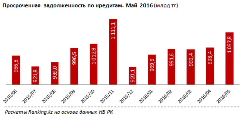 Просроченная задолженность по кредитам банков в мае 2016 года снизилась на 23,3% по сравнению с маем прошлого года, до 1 трлн тг. При этом доля проблемных кредитов физических лиц выросла с 29,4% до 40,3% за счет снижения корпоративных долгов с 973 млрд тг до 632 млрд тг.