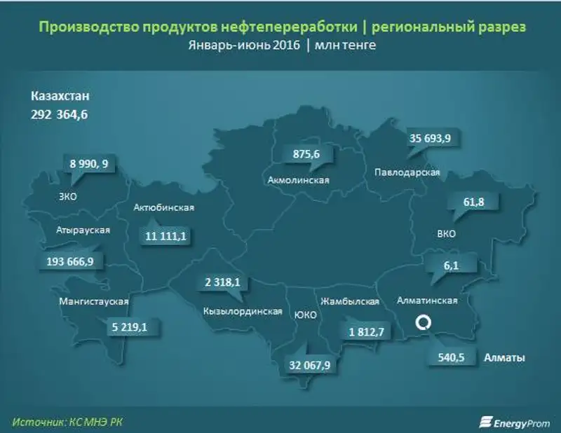 В региональном разрезе среди тройки областей с нефтеперерабатывающими мощностями по темпам роста лидирует Павлодарская область - плюс 63% год-к-году, до 35,7 млрд тг. Далее - Атырауская область (плюс 55,5% за год, до 193,7 млрд тг) и ЮКО (плюс 25,3%, до 32,1 млрд тг).