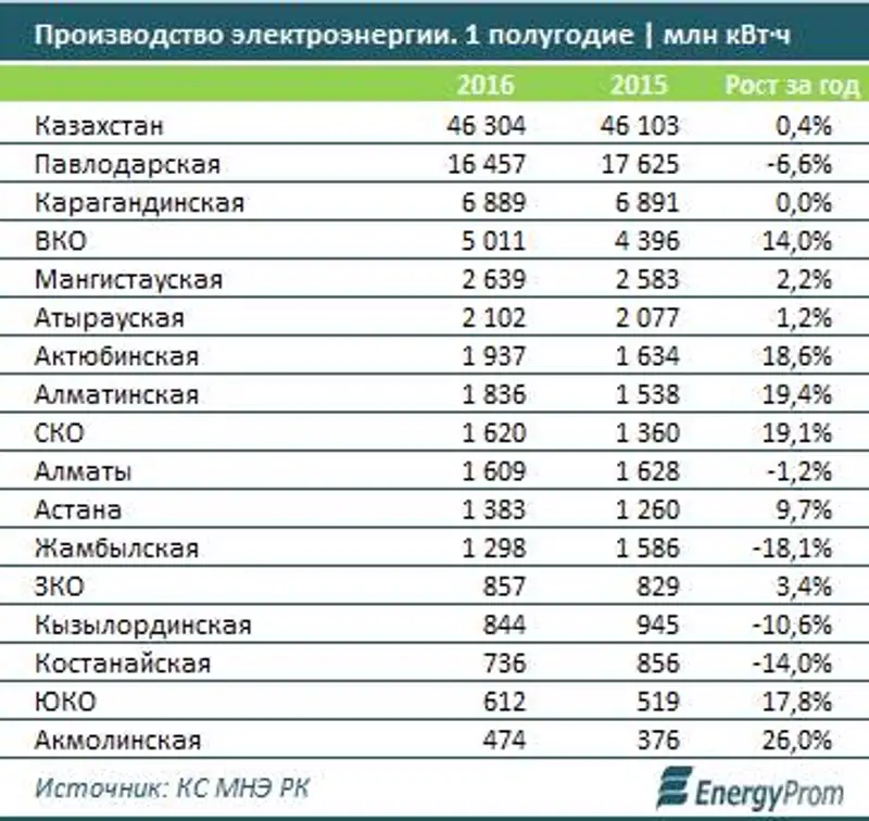 Прирост генерации отмечен в восьми регионах. Рост в Акмолинской, Южно-Казахстанской, Карагандинской, Северо-Казахстанской и Актюбинской областях связан с введением новых генерирующих мощностей. В Восточно-Казахстанской и Алматинской областях прирост генерации в июне текущего года в сравнении с аналогичным периодом прошлого года вызван увеличением выработки на гидроэлектростанциях (ГЭС), что обусловлено увеличенным расходом воды в данных регионах.